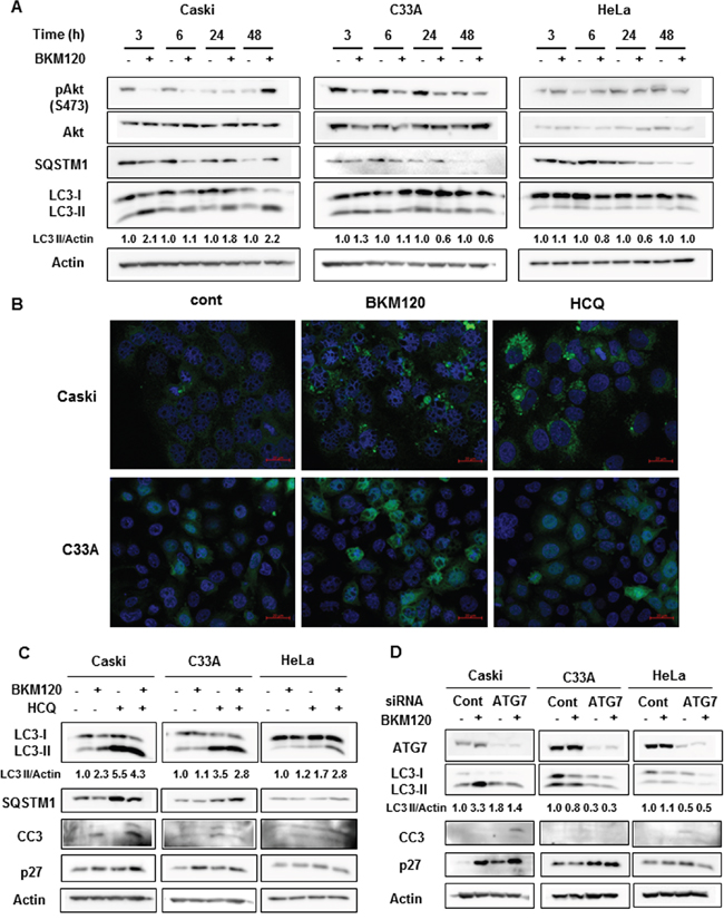 To investigate the role of autophagy in the response to PI3K inhibitors, we assessed autophagy induction in cervical cancer cell lines with or without PIK3CA mutations. During autophagy induction, the non-lipidated form of LC3 (LC3-I) is conjugated with phosphatidylethanolamine (PE), then converted into the lipidated form of LC3 (LC3-II), resulting in the increase of LC3-II level or LC3-II/LC3-I ratio [14]. Western blot analysis after BKM120 treatment for the indicated periods revealed a significant increase in the LC3-II level as early as 3 h that was maintained for up to 48 h in Caski cells (Figure 2A), indicating autophagy induction by BKM120 treatment. In contrast, there was no significant increase in LC3-II level upon BKM120 treatment in C33A or HeLa cells. In addition to LC3-II, SQSTM1 has been also examined as a marker of autophagy induction. The SQSTM1 as a cargo protein links LC3 and ubiquitinated substrates, which are degraded during autophagic flux [14]. The decrease in SQSTM1 level was shown at early time points of 3 and 6 hours after BKM120 treatment in Caski cells even though SQSTM1 level did not always inversely correlate with LC3-II level. There was no significant change of SQSTM1 in C33A cells. Unexpectedly, although significant change of LC3-II and Akt phosphorylation levels by BKM120 treatment was not observed in HeLa cells, SQSTM1 level was somewhat affected by BKM120 treatment. It might be explained that some unknown off-targets of BKM120 can affect expression levels of SQSTM1 regardless of PI3K-Akt pathway and autophagy in HeLa cells. To further confirm autophagy induction by BKM120 treatment, we monitored LC3 puncta which indicate autophagosome formation. BKM120 treatment induced LC3 puncta in Caski cells stably expressing EGFP-LC3, but rarely in C33A cells expressing EGFP-LC3 (Figure 2B), indicating that PI3K inhibition by BKM120 induces autophagy in Caski cells but not in C33A even though both cell lines harbor activating mutations in PIK3CA. HCQ treatment was here used as a positive control for LC3 puncta (Figure 2B). Due to the different response to BKM120, we examined whether BKM120 effectively blocked the PI3K–Akt signaling pathway in these cell lines. The phosphorylation of Akt at Serine 473 (S473) was effectively inhibited by BKM120 in Caski and C33A cells even though it was not completely blocked (Figure 2A). In Caski cells, the level of Akt phosphorylation at S473 was recovered at the basal level at 24 hours and rather increased compared with the basal level at 48 hours after BKM120 treatment. Considering the result of cell viability assay showing that the treatment of BKM120 alone did not significantly affect the viability of Caski cells (Figure 1), a rapid adaptive resistance mechanism to BKM120 seems to work in these cells. The basal level of Akt phosphorylation at S473 was low and not significantly affected by BKM120 treatment in HeLa cells carrying wild-type PIK3CA. These results indicate that PI3K inhibition does not uniformly induce autophagy as a cytoprotective mechanism in all PIK3CA-mutant cervical cancer cell.