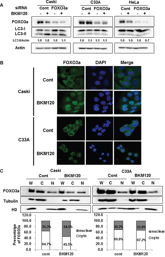 We wondered why Caski and C33A cells harboring activating mutation in PIK3CA respond differently in autophagy induction upon PI3K inhibition. We first examined the cellular localization of FOXO3a in Caski and C33A cells because its subcellular localization is a crucial determinant of its function. Interestingly, confocal immunofluorescence microscopy demonstrated that FOXO3a was translocated from the cytoplasm to the nucleus upon BKM120 treatment in Caski cells, whereas most of FOXO3a was still retained in the cytoplasm in C33A cells (Figure 3B). Cell fractionation analysis further confirmed significant BKM120-induced nuclear translocation of FOXO3a in Caski cells (nuclear FOXO3a levels increased from 35.3% to 54.5%), whereas FOXO3a predominantly remained in the cytoplasmic fraction in BKM120-treated C33A cells (nuclear FOXO3a levels increased from 30.2% to 32.8%) (Figure 3C). To assure whether the difference in subcellular localization of FOXO3a shown in Caski and C33A cells also occurs in other PIK3CA-mutant cancer cell lines, subcellular localization of FOXO3a was examined in T47D and ME180 cells. Nuclear translocation of FOXO3a after BKM120 treatment was observed in T47D, which responded to the combined treatment of BKM120 and HCQ (Supplementary Figure 2 and Supplementary Figure 1). In contrast, majority of FOXO3a was still retained in the cytoplasm upon BKM120 treatment in ME180 cells, which did not respond to the combined treatment (Supplementary Figure 2 and Supplementary Figure 1). These results suggest that nuclear translocation of FOXO3a by BKM120 treatment might induce cytoprotective autophagy in Caski and T47D cells and that the cytoplasmic retention of FOXO3a even upon BKM120 treatment might be a major reason why BKM120 did not elicit autophagy in C33A and ME180 cells.