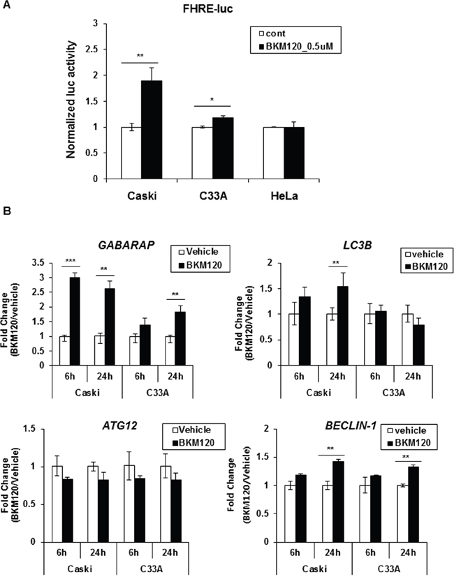 Figure 4: BKM120 induces FOXO transcriptional activity in Caski cells, but not in C33A cells. A. Cells were transiently co-transfected with FHRE-luc and Renilla for 24 h and then treated with 0.5 μM BKM120 for a further 24 h. The cells were harvested and luciferase activity was measured. Firefly luciferase activity was normalized to Renilla activity. Data are the mean of three replicates. Bars, ± SD; *P < 0.01, **P < 0.05. B. Cells were treated with 1 μM BKM120 for the indicated periods. Total RNA was extracted and mRNA levels of GABARAP, LC3B, ATG12, and Beclin-1 were determined by real-time PCR. The fold-change in mRNA levels was calculated by normalization to GAPDH. Data are the mean of three replicates; bars, ± SD; **P < 0.05, ***P < 0.005.