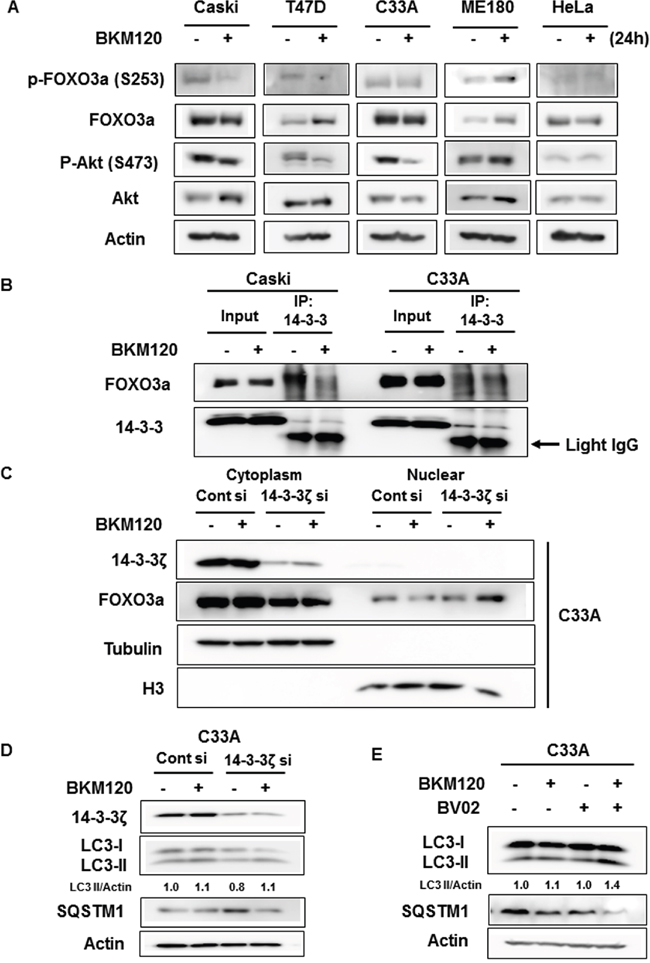 Figure 5: Dissociation of FOXO3a from 14-3-3 by BKM120 treatment mediates FOXO3a activation and autophagy induction. A. Cells were treated with 0.5 μM BKM120 for 24 h and cell lysates were immunoblotted with the indicated antibodies. Actin was used as the loading control. B. Cells were treated with 1 μM BKM120 for 24 h. Cell lysates were immunoprecipitated with anti-pan-14-3-3 antibody, followed by immunoblot analysis for FOXO3a or 14-3-3. Arrow indicates the light IgG chain. C. C33A cells were transfected with control siRNA or 14-3-3ζ siRNA for 48 h and then treated with 1 μM BKM120 for 6 h, followed by parallel subcellular fractionation. Lysates were immunoblotted with the indicated antibodies. α-tubulin and H3 were used as cytosolic and nuclear markers, respectively. D. C33A cells were transfected with control siRNA or 14-3-3ζ siRNA for 48 h and then treated with 1 μM BKM120 for 6 h. Cell lysates were immunoblotted with the designated antibodies. Actin was used as the loading control. E. C33A cells were treated with 1 μM BKM120 alone or in combination with 5 μM BV02 for 6 h. Cell lysates were immunoblotted with anti-LC3B antibody. Actin was used as the loading control. LC3-II level was quantified by densitometry and normalized with Actin level. After normalization, LC3-II level was compared to that of non-treated control.