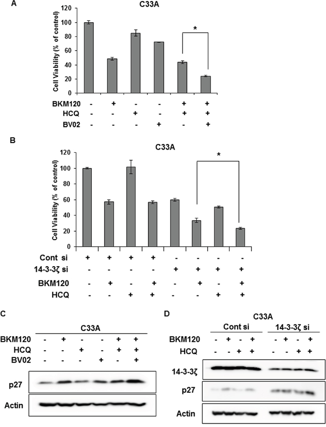 Next, we examined the levels of p27 and CC3 to determine whether the significantly reduced cell viability upon co-treatment with these three drugs in C33A cells is caused by cell cycle arrest or apoptosis. Combined treatment of C33A cells with BKM120, HCQ, and BV02 significantly augmented p27 level compared with treatment with each drug alone or with BKM120 plus HCQ (Figure 6C). Consistently, combined treatment with BKM120 and HCQ together with 14-3-3ζ knockdown also enhanced p27 levels more significantly than BKM120 treatment alone with 14-3-3ζ knockdown or co-treatment with BKM120 and HCQ in control siRNA-treated cells (Figure 6D). However, CC3 or PARP cleavage was not detected under the same conditions (data not shown), indicating that the reduced cell viability by co-treatment with BKM120, HCQ and BV02 or with 14-3-3ζ knockdown might be the result of cell cycle arrest rather than apoptosis.