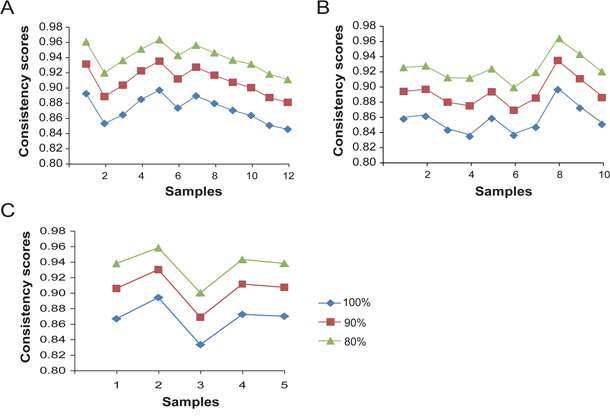Figure 2: The consistency scores of REOs of gene pairs between every FFPE sample and its paired FF sample. The consistency scores between every paired FFPE and FF samples after excluding zero, 10% and 20% gene pairs with the smallest expression differences in each of the FF samples for lung adenocarcinoma A., colon adenocarcinoma B. and breast invasive cancer C.
