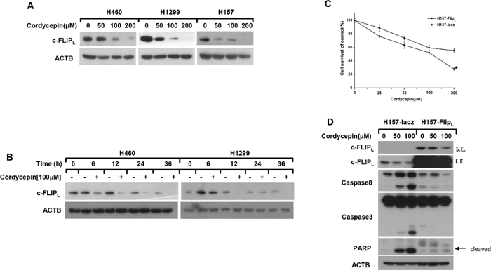 Furthermore, we inspected the mechanism of cordycepin-induced apoptosis and discovered that the expression of c-FLIPL was dramatically down-regulated, and the ectopic expression of c-FLIPL decreased the cleavage of caspase-8, caspase-3 and PARP, protecting H157-FLIPL cells from cordycepin-triggered extrinsic apoptosis. Our results provide detailed clues to explain cordycepin-induced apoptosis.