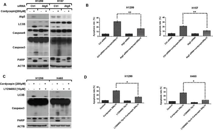 To further confirm the interaction between apoptosis and autophagy by cordycepin, H460 and H1299 were pretreated with LY294002, an early inhibitor of autophagy for 1 h, and then exposed to 200 μM cordycepin for 12 h. According to Figure 4C, co-treatment with LY294002 and cordycepin apparently decreased the cleavage of caspase3 and PARP, which was in accordance with the results of flow cytometry analysis (Figure 4D). Consequently, we come to the conclusion that cordycepin-induced autophagy facilitates apoptosis.