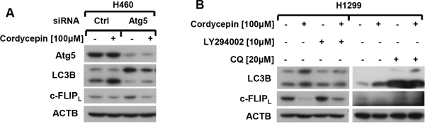 Figure 5: Cordycepin promotes c-FLIP degradation through activating autophagy. A. H460 cells were seeded in six-well plates and treated with Atg5 siRNA on the next day. After Forty-eight hours transfection, cells were exposed to 100 μM cordycepin for 12 h. Thereafter, cells were harvested and prepared for western blot analysis. B. H1299 cells were pretreated with 10 μM LY294002 or 20 μM CQ for 1h, and then exposed to 100 μM cordycepin for another 12 h. The whole-cell protein lysates were harvested and subjected to western blot analysis.