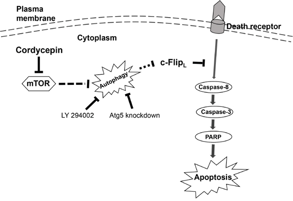 Figure 6: The schematic model of cordycepin-triggered apoptosis and autophagy in human NSCLC cells. Cordycepin treatment stimulates extrinsic apoptosis pathway by inhibiting the expression of c-FLIPL. Furthermore, cordycepin also triggered autophagy through suppression of mTOR signaling pathway. Cordycepin-induced autophagy promoted apoptosis through degrading c-FLIPL.