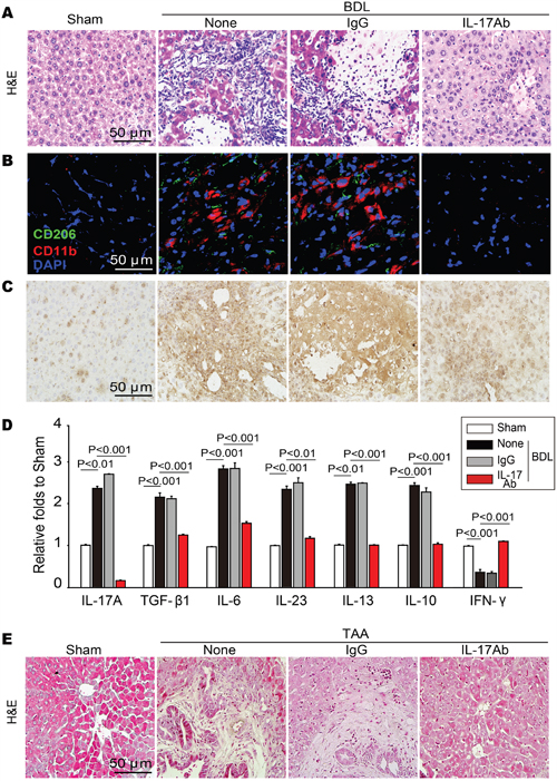 Figure 2: Neutralization of IL-17A resolved BDL or TAA-induced acute or chronic inflammation in hepatic tissue. A. Neutralizing IL-17A repressed the BDL-induced recruitment of inflammatory cells as indicated by H&E staining of the liver sections, B. specially decreased the infiltration of M2-type macrophage (CD11b+CD206+). C. The representative photomicrographs of liver-infiltrating Th17 cells, which was assessed by immunohistochemistry. D. Blocking IL-17A attenuated the increase in the levels of IL-17A production associated Th2 and Treg cytokines but up-regulated the level of Th1 cytokine. The contents of IL-17A, TGF-β1, IL-6, IL-23, IL-13, IL-10 and IFN-γ in liver tissue homogenates were detected by ELISA analysis. E. H&E staining of the liver sections indicated that neutralization of IL-17A resolved the TAA-induced chronic inflammation. Data are mean ± SEM (n=8 group-1 experiment-1) of three independent experiments.