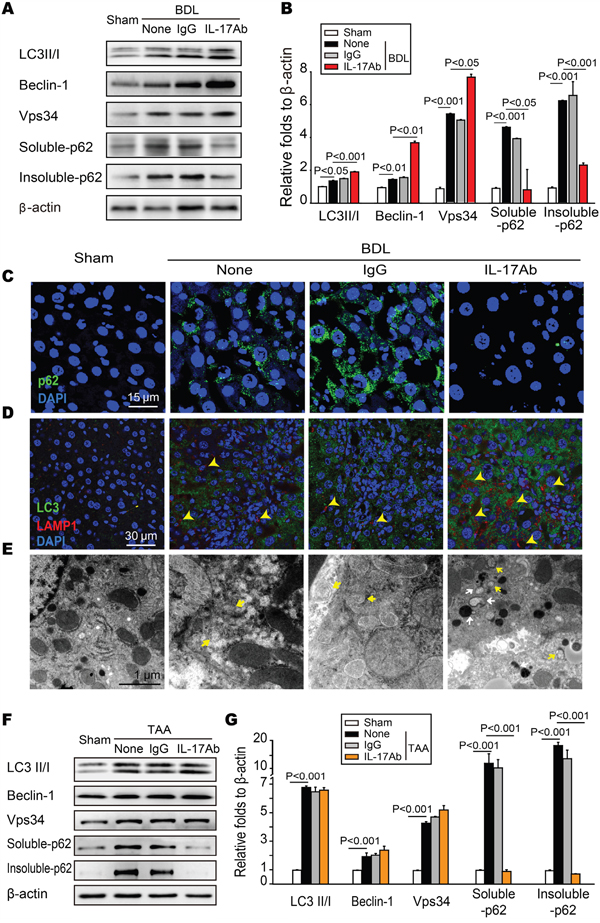 Figure 3: Neutralization of IL-17A restored BDL or TAA-induced autophagy suppression in hepatic tissue. A and B. Neutralization of IL-17A regulated the expression of autophagy-associated proteins in BDL-treated livers. The livers were homogenated and the expression of LC3II/I, Beclin-1, Vps34, soluble-and insoluble-p62 was detected with Western blotting. Data are representative immunoblots and the ratios of the indicated protein to β-actin of three independent experiments. C. Blocking IL-17A enhanced the degradation of p62 in liver from BDL-treated mice, which was detected with confocal microscopy. D. Autolysosomes were evaluated with the co-localization of LC3 and LAMP-1 using confocal microscopy. Neutralizing IL-17A increased the numbers of autolysosomes (yellow arrows) in liver tissue. E. Blocking IL-17A increased the number of autophagosomes (Avi) and autolysosomes (Avd) in hepatocytes from BDL-treated mice. Data are representative images of electron microscopic analysis of three independent assays. Yellow arrows denote Avi; White arrows indicate Avd. F-G The expression of LC3II/I, Beclin-1, Vps34, soluble-and insoluble-p62 in TAA-induced liver hepatic tissue was analyzed with Western blotting. Representative immunoblots and the ratio of the level of indicated protein to β-actin from three independent experiments are presented.