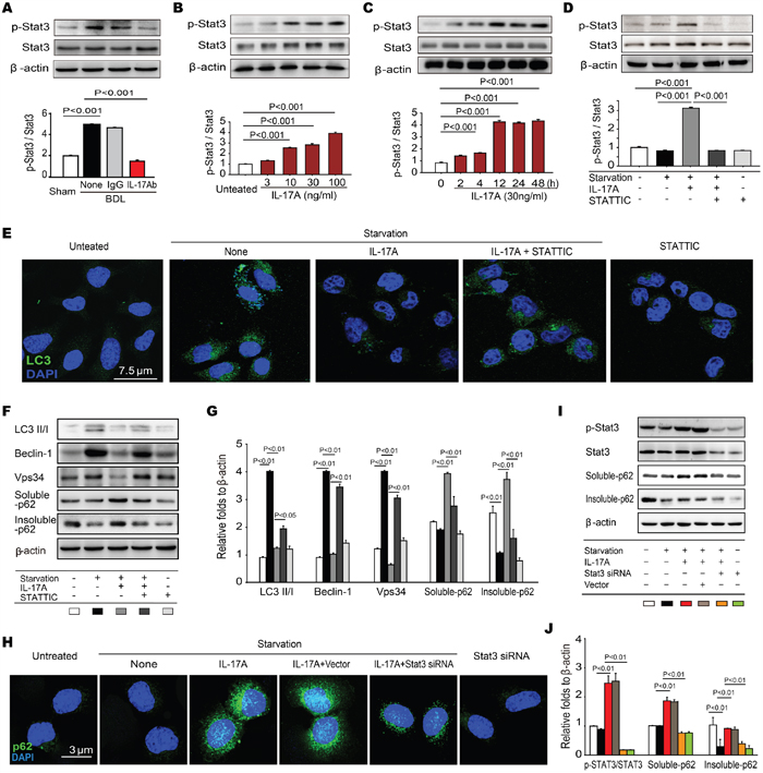 Figure 4: IL-17A inhibits autophagy by activating STAT3. A. The representative images of Western blots and the summary ratio of p-STAT3 to STAT3 in hepatic tissues. B and C. IL-17A stimulated the concentration-and time-dependent phosphorylation of STAT3 in AML-12 cells. The AML-12 cells were treated with the indicated concentrations of IL-17A for 24 hours or the cells were treated with 30 ng ml-1 of IL-17A for the indicated times, and the level of p-STAT3 and STAT3 was detected with Western blot assay. D. AML-12 cells were starved for 2 hours and treated with or without the indicated concentrations of IL-17A or STATTIC. The summary ratio of p-STAT3 to STAT3 was detected with Western blotting. E. Confocal analysis of LC3 expression in AML-12 cells. (F-G) STATTIC protected IL-17A (30 ng ml-1) from the inhibition of the starvation-induced autophagy in AML-12 cells. The expression of autophagy-associated proteins was detected with Western blotting. H. Silencing STAT3 prevented IL-17A-suppersed autophagy. STAT3 gene in AML-12 cells were silenced by STAT3 siRNA or vector and starved for 2 hours and treated with or without the indicated concentrations of IL-17A (30 ng ml-1). The aggregation of p62 was detected with confocal microscopy. I-J The expression of p-STAT3, STAT3, soluble-and insoluble-p62 in AML-12 cells was analyzed with Western blotting. Data are mean ± SEM of three independent assays.