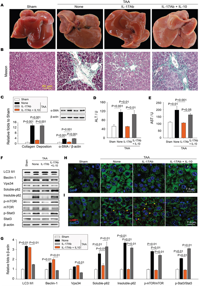 The mouse IL-17A protein was purchased from Peprotech (Rocky Hill, NJ). The neutralizing mouse IL-17A mAb was obtained from R&D Systems (Minneapolis, MN). Anti-mouse α-SMA, IL-17R, RORγt, p-STAT3, STAT3, LC3 II/I, Beclin-1, LAMP-1, Vps34, CD11b, CD206, and β-actin Abs were purchased from Cell Signaling Technology (Danvers, MA). Anti-mouse p62 Ab and thioacetamide (TAA) were purchased from Sigma (St. Louis, MO). Alexa Fluor 488 and 647 Abs were obtained from Invitrogen (San Diego, CA). The assay kits for Alanine aminotransferase (ALT) and aspartate aminotransferase (AST) were obtained from Nanjing Jiancheng Bioengineering Institute (Nanjing, China). The ELISA kits for IL-17A, TGF-β1, IL-6, IL-23, IL-13, IL-10 and IFN-γ were purchased from eBioscience (San Diego, CA). Other materials were purchased from commercial sources.