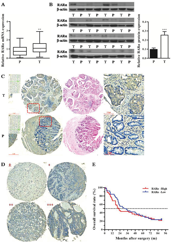 Figure 1: Expression and clinical significance of RARα in GC tissues. A. Expression of RARα mRNA in T and P tissues was assessed by Q-PCR. The data were normalized to GAPDH. The error bars presented as mean ± SEM. B. Expression of RARα protein in T and P tissues was assessed by Western blot. β-actin served as loading control. C. IHC analysis of RARα protein in GC tissue microarray. Zoom: 100×, 400×. D. Four grades of RARα staining intensity. E. Kaplan–Meier survival analysis of RARα expression in GC patients. T, tumor; P, paracarcinoma tissues; ** P < 0.01, *** P < 0.001.