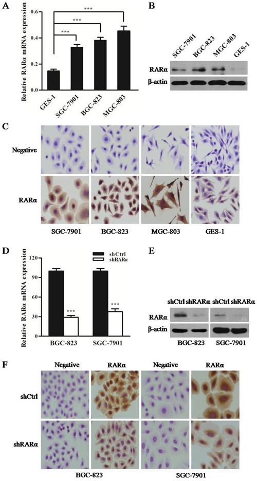 Figure 2: Expression of RARα in GC cell lines and constructed cell models. A. Expression of RARα mRNA in GC cells was detected by Q-PCR. The data were normalized to GAPDH. The error bars presented as mean ± SEM. B. Expression of RARα protein in GC cells was detected by Western blot. C. ICC analysis of RARα in GC cells. Zoom: 200×. D-F. Construction of RARα knockdown cell model in SGC-823 and SGC-7901 were identified by Q-PCR, Western blot and ICC. *** P < 0.001.