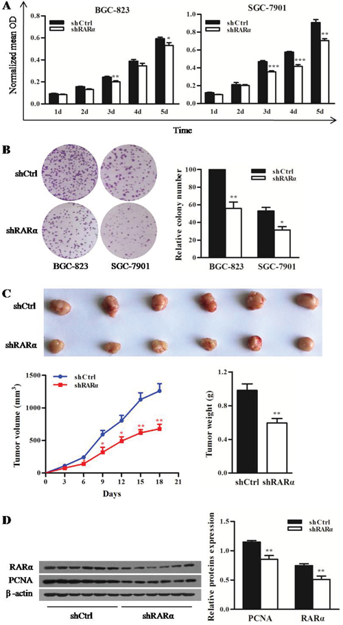 Figure 3: Effect of RARα knockdown on the proliferation of GC cells in vitro and in vivo. A. MTT analysis for the proliferation of BGC-823 and SGC-7901 cells after RARα knockdown. B. Control or RARα knockdown of BGC-823 and SGC-7901 cells were subjected to anchorage-dependent clonogenic assay. Representative pictures for colony growth are shown (right). Quantification of the number of colonies was normalized with that of shCtrl-BGC-823 cells (left). C. shRARα-BGC-823 cells and control cells were subcutaneously injected in nude mice to establish xenograft tumors. Representative tumors and their volume are depicted graphically; n = 6 (for each group). Error bar represents SEM. D. Western blot analysis for PCNA and RARα in shCtrl and shRARα xenograft tumors with β-actin as a loading control. * P < 0.05, ** P < 0.01. *** P < 0.001.
