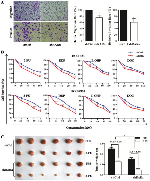 Figure 4: Critical role of RARα in cellular motility, invasion and drug susceptibility. A. Control or RARα knockdown of BGC-823 were subjected to transwell migration (without Matrigel) and invasion (with Matrigel) assays. Cells invading Matrigel were imaged in a bright-field microscope under 200× magnification (right). Image software analysis for the results of three independent experiments (left). B. MTT assay performed in shCtrl or shRARα of BGC-823 and SGC-7901 to detected the drug susceptibility to 5-FU, DDP, L-OHP and DOC. C. The drug susceptibility of shCtrl or shRARα of BGC-823 xenograft tumor to 5-FU were shown (right) and analyzed (left), n = 6 (for each group). * P < 0.05, ** P < 0.01, *** P < 0.001.