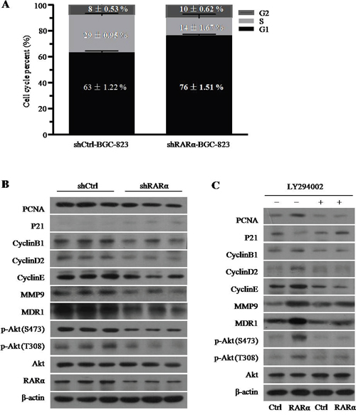 Figure 5: The role and mechanism of RARα in the GC cell development and progression. A. Cell cycle was analysed by flow cytometry after RARα knockdown. B. Western blot analysis of cell cycle, proliferation, invasion, drug resistance and Akt signaling associated proteins expression after RARα knockdown in BGC-823. C. Effect of LY294002 and (or) RARα overexpression on the expression of cell cycle, proliferation, invasion, drug resistance and Akt signaling associated proteins expression in BGC-823. LY294002, 1μM.