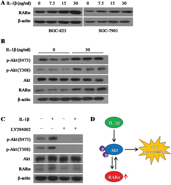 Figure 6: IL-1β induced RARα overexpression via activation Akt signaling. A. Western blot analysis for RARα expression after treatment with different concentration of IL-1β for 24 hour. B. Western blot analysis for RARα expression and the activation of Akt signaling after treatment with IL-1β for 24 hour in BGC-823. C. After treatment with IL-1β and (or) LY294002 for 24 hour, expression of RARα, p-Akt and Akt were detected by Western blot in BGC-823. IL-1β, 30 ng/ml; LY294002, 1 μM. D. Schematic diagram for the positive feedback loop of IL-1β/Akt/RARα/Akt signaling.