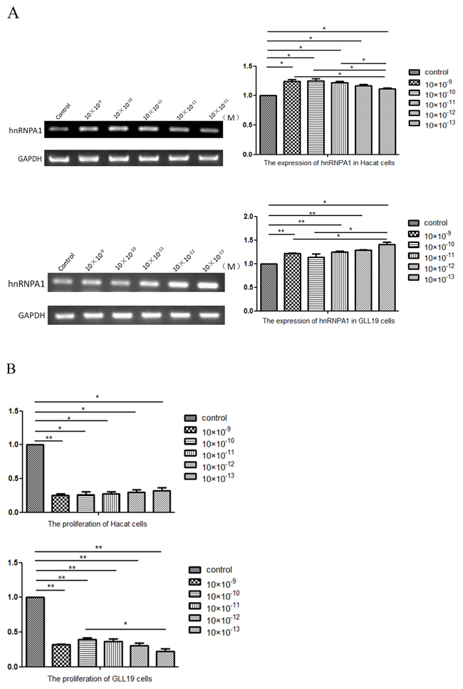GLL19 and Hacat cells were treated with different concentrations of estradiol from 10×10-9M to 10×10-13M. The expression of hnRNPA1 and cell proliferation was determined by RT-PCR and MTT assay, respectively. As shown in Figure 1, estradiol elevated the expression of hnRNPA1 at the gene level (Figure 1A) and inhibited cell growth (Figure 1B) in both cell lines. The Hacat cells were much less sensitive to the 10×10-13M estradiol compared to that of melanoma GLL19 cells. Therefore, we selected 10×10-13M estradiol to treat cells in the following experiments.