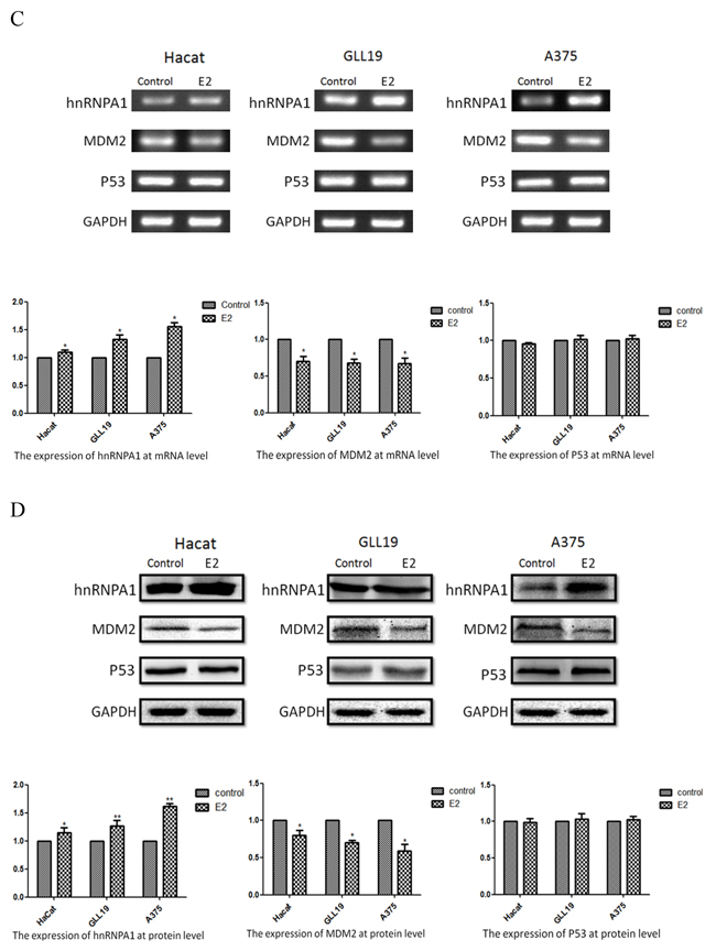 Considering that the MDM2 gene is correlated to P53, the potential roles of P53 in the decline of MDM2 with estradiol-treatment were investigated. After the treatment with estradiol for 96 hours, the Hacat, GLL19 and A375 cell lines were harvested and P53 expression was measured at mRNA level (Figure 1C). In addition, the modification of P53 expression at protein level was determined by western blot (Figure 1D), and there was just a slight change in P53 after the treatment of estradiol. Consequently, the decrease of MDM2 by hnRNPA1 did not correlate with a rise in P53.