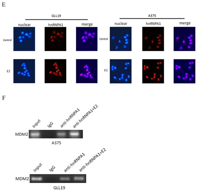 We next investigated the effects of estradiol on the expression and cellular function of hnRNPA1 and MDM2. 10×10-13M estradiol induced the expression of hnRNPA1 at mRNA (Figure 1C) and protein level (Figure 1D) in Hacat, GLL19 and A375 cell lines. In the meanwhile, MDM2 (Figure 1C, 1D) were negatively regulated after the treatment of estradiol. For GLL19 and A375 cell lines, the staining for hnRNPA1 were significantly elevated in the estradiol-treated cells in comparison with control cells (Figure 1E). But there was no change about the location of hnRNPA1. These results suggested that estradiol, which influenced the MDM2 expression in skin cancer cells, elevated the expression of splicing factor hnRNPA1 but did not alter its location.