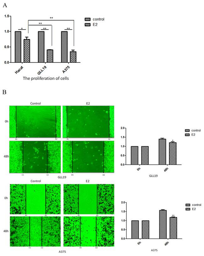 Figure 2: The proliferation and immigration of cells were inhibited by estradiol treatment. A. Hacat, GLL19 and A375 cells were exposed to 10×10-13M estradiol for 96 hours, and MTT assay was used to test the change of cell proliferation. B. Confluent monolayer of GLL19 and A375 cell lines were wounded (A1A2 and B1B2) and cultured with mitomycin, 10×10-13M estradiol and vehicle. Estradiol treatment induced the decrease of migration areas (“A1C1 plus A2C2”vs “B1D1 plus B2D2”) as compared to thevehicle-treated cells.(n=3, a representative experiment is shown; ‘*’means P<0.05; ‘**’means P<0.01).