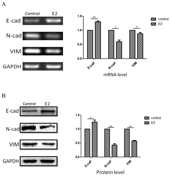 Figure 3: Correlations of estradiol on expressions of E-cadherin, N-cadherin and vimentin. A375 cancer cells were incubated with 10×10-13M estradiol for 96 hours, and expression of these three markers were measuredat gene level A. and protein level B. Results were expressed as percent of GAPDH vs. vehicle-treated cells. (n=3, a representative experiment is shown; ‘*’means P<0.05; ‘**’means P<0.01).