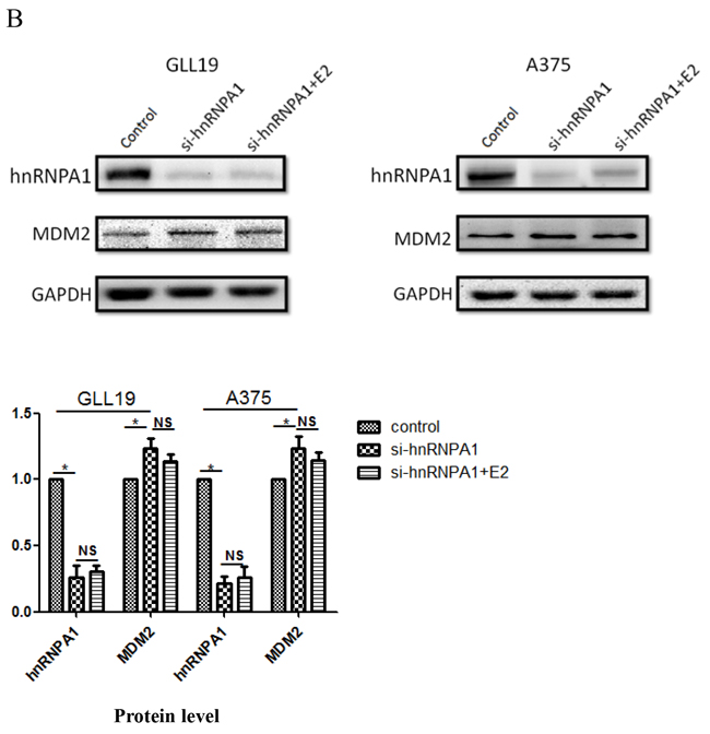 Figure 4: Changes of the MDM2 expression by depleting of hnRNPA1. GLL19 cells were A. further investigation by transfected with control siRNA and hnRNPA1 siRNA±estradiol, then the relative mRNA level or B. protein level of hnRNPA1 as well as MDM2 were presented by the quantitative values on these charts. Results were expressed as percent of GAPDH vs. vehicle-treated cells. (n=3, a representative experiment is shown; ‘*’means P<0.05; ‘**’means P<0.01. ‘NS’ means no significance).