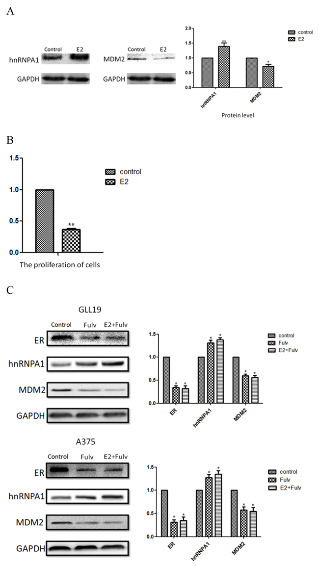 GLL19 and A375 are highly metastatic melanomas that can express estrogen receptors [12, 32]. Considering that the transcriptional activation of MDM2 canrespond to estrogen through estrogen receptor (ER), we further investigated the influence of estradiol on MDA-MB-231 cellswhich are estrogen receptor negative (ER-) cells [33]. These data were similar to those in GLL19 and A375 cells and we confirmed that estradiol also up-regulated hnRNPA1 and then altered the expression of MDM2 (Figure 5A). The estradiol resulted in approximately 60% inhibition efficiency on cell proliferation in the MDA-MB-231 cells (Figure 5B) (P<0.01). In the next section, we used fulvestrant which acts as an ER antagonist to suppress the expression of ER in GLL19 and A375 cells, following with the treatment of estradiol as before [34]. It was interesting to find that fulvestrant leading to the up-regulation of hnRNPA1 at the same time, and the results almost had no differences after the addition of estradiol (Figure 5C). These experiments imply that hnRNPA1 correlating MDM2 expression may not only relate to the estrogen receptor.