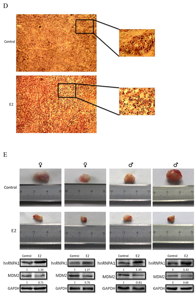 To validate the mechanisms of estradiol in vivo, we assessed the expression of hnRNPA1 and MDM2 of tumor tissues at protein levels (Figure 6E). Consistent with the results of our in vitro experiments, the expression of hnRNPA1 was increased and the expression of MDM2 was decreased.