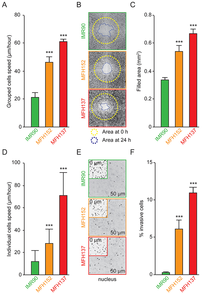 Figure 1: MFH137 and MFH152 sarcoma cell lines have a great invasive and motile potential. (A) Confluent IMR90 fibroblast or MFH152 or MFH137 sarcoma cell monolayers were scratched with pipet tips and imaged every hour to study collective migration. Quantitative histogram shows the average speed, calculated from the wound closure rate, using image J software. (B) and (C), two-dimensional migration assay using the Oris™ cell assay. Cells were allowed to migrate for 24h after the removal of cell seeding stoppers, fixed and stained with phalloidin to evaluate their motile potential. Representative photomicrographs are shown in panel (B), the yellow broken lines show the empty migration zone at the start of the experiment while the blue lines delimit the cell-free area after 24h of migration. Quantitative data are presented in panel (C). (D) Speed of individual IMR90, MFH152 and MFH137 cells was evaluated using the CytooChips Motility system to follow individual cell migration. (E) and (F) Invasive potential of IMR90, MFH152 and MFH137 cell lines measured after 24h. Representative micrographs show starting cell density at 0μm (E, insets) and invasive cells at 50 μm (E). Quantitative data are represented in panel (F). For all experiments, data are reported as means ± SEM (n ≥ 3). ***p < 0.001 (ANOVA test), as compared with the human fibroblast IMR90 cell lines.