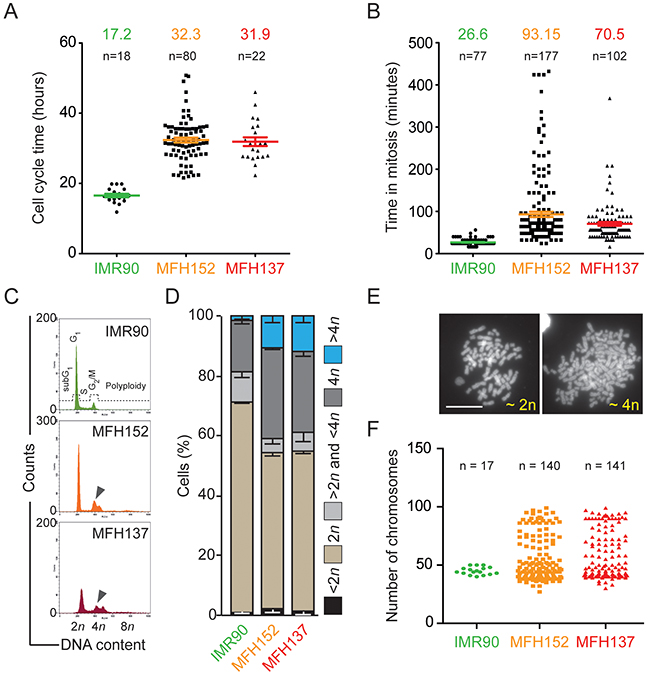 Figure 2: MFH137 and MFH152 sarcoma are a heterogeneous population. (A) and (B) quantitative analyses of cell cycle and mitosis length of IMR90, MFH152 and MFH137 cell lines following image acquisition of the cell lines for up to 72h. Panel (A) displays the quantitative data of cell cycle duration, while panel (B) shows the length of mitosis. (C) and (D) IMR90, MFH152 and MFH137 cells lines were fixed and stained with propidium iodide for cytofluorometric assessment of cell cycle progression. Cell cycle distribution analysed by flow cytometry panel (C) and quantitative data (means ± SEM; n = 3) of corresponding flow cytometry profiles panel (D) are shown. (E) and (F) Metaphase spread of IMR90, MFH152 and MFH137 cells lines. Panel (E) shows examples of DAPI-stained chromosomes in the metaphase spreads with the corresponding ploidy while panel (F) reports quantitative data.