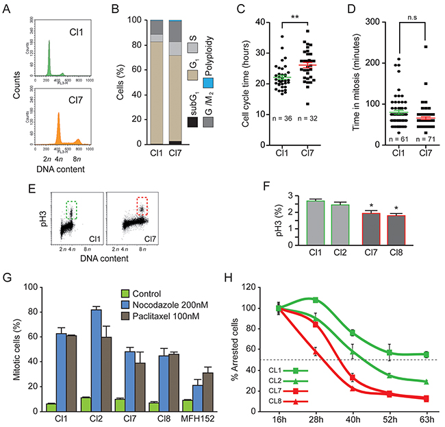 Figure 3: Cell cycle of diploid and tetraploid clones is similar but tetraploid clones have a weak spindle assembly checkpoint. (A) and (B) Diploid (Cl1) and tetraploid (Cl7) MFH152 clones were fixed and stained with propidium iodide for the cytofluorometric assessment of cell cycle progression. Cell cycle distribution analysed by flow cytometry is displayed in panel (A). Quantitative data of corresponding flow cytometry profiles are plotted in panel (B). (C) and (D) Diploid (Cl1) and tetraploid (Cl7) MFH152 clones were imaged for up to 72h, by time lapse microscopy, to evaluate their respective cell cycle length and the time spent in mitosis. Panel (C) displays the quantitative data of cell cycle duration, while panel (D) shows the length of mitosis. **p < 0.05 (ANOVA test), n.s., not significant. (E–F) Fraction of G2/M cells present in two diploid and two tetraploid clones were analyzed by Flow cytometry profile (E) and quantified (F) following staining with antibodies directed against Ser10 Phospho-histone H3 (means ± SEM; n = 3). (G–H) Robustness of SAC in two diploid and two tetraploid clones. Percentage of the cell population arrested in mitosis following 16 hours exposure to carrier (control), nocodazole (200nM) or paclitaxel (100nM) (G) and percentage of the total number of arrested mitotic cells at 16 hours (100%) sustaining SAC over prolonged exposure to nocodazole (means ± SEM; n = 3).
