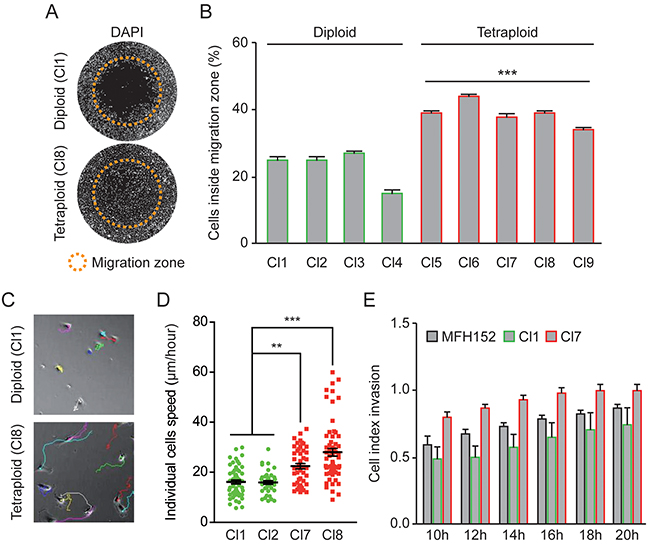 Figure 4: Tetraploid clones are more motile and invasive than diploid clones. (A–B) Four diploid (Cl1-4) and five tetraploid (Cl5-9) MFH152 clones were plated using the Oris™ cell migration assay and grown for 24h before fixation. DAPI staining was used to evaluate the cells migratory potential. Representative micrographs are shown in panel (A) while panel (B) shows the percentage of nuclei inside the migration zone (means ± SEM; n = 3), ***p < 0.001 (ANOVA test, each tetraploid over each diploid). In panel (A), orange circles show the migration zone at the start of the experiment (0h). (C–D) Two diploid (Cl 1-2) and two tetraploid (Cl 7-8) MFH152 clones were grown in non-confluent conditions and imaged for 24 hours, using time-lapse microscopy, to evaluate respective migration potential of individual cells. Panel (C) shows representative micrographs of the trajectories reconstituted using imageJ software of some cells from diploid (cl1) and tetraploid (cl8) clones, while panel (D) shows the individual cells speed (means ± SEM; n = 3), ***p < 0.001, **p<0.05 (ANOVA test). (E) Invasive behavior of cells from a diploid (Cl 1), a tetraploid (Cl 7) clones and MFH152 mother cell line was followed between 10 and 20 hours after seeding using the xCELLigence RTCA DP instrument (Ozyme, France) (means ± SEM; n = 4).