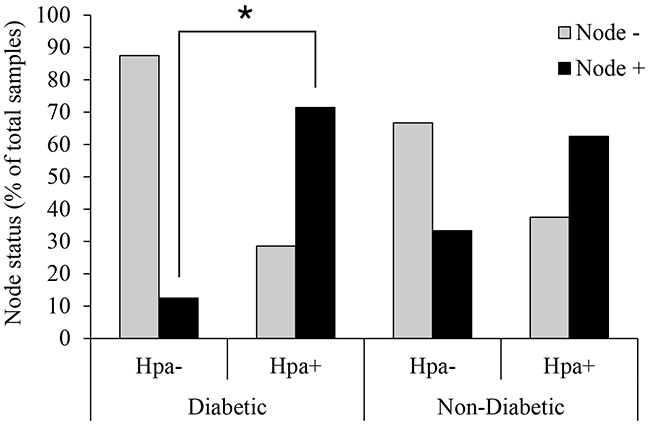 Figure 1: Heparanase expression and lymph node involvement in diabetic breast carcinoma patients. Human breast carcinoma tissue samples (biopsies) were processed for immunohistochemistry with anti-heparanase antibody (733) directed against a synthetic peptide (158KKFKNSTYRSSSVD171) corresponding to the N-terminus of the 50-kDa subunit of the heparanase enzyme, as described in [28, 57, 58]. Diabetic state, BMI and lymph node status were determined from patient history. Node+: patients with lymph node positive tumors; Node-: patients with lymph node negative tumors. Two-sided Fisher’s exact test confirmed that in diabetic patients heparanase-positive tumors are more likely to spread into lymph nodes (*p=0.04). Presence of heparanase in non-diabetic breast tumor samples did not confer statistical significant difference in lymph node involvement.