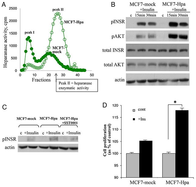 Here we present the evidence that activity of heparanase enzyme (the only known mammalian endoglycosidase that cleaves HS) leads to enhanced insulin signaling and activation of downstream tumor-promoting pathways in breast carcinoma cells.