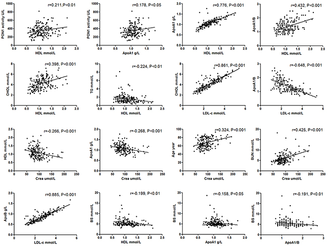 We also assessed other factors that affect the serum PON1 activity. PON1 activity was not associated with age, hypertension, alcohol consumption, creatinine, blood urea nitrogen (BUN), Total cholesterol (TC), Triglycerides (TG) or LDL-C. The serum PON1 activity was significantly lower in the low HDL-C group compared with the normal HDL-C group and positively correlated with the amount of HDL-C, which suggested the PON1 activity level was associated with the amount of HDL-C. In addition, the PON1 activity level was significantly lower in smokers and males. Thus, smoking and gender affected the serum PON1 activity.