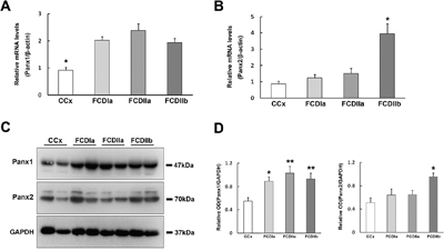 Figure 1: Expression of Panx1 and Panx2 in FCD and CCx. A. Real-time PCR analysis of Panx1 mRNA expression in CCx (n = 8), FCDIa (n = 8), FCDIIa (n = 8) and FCDIIb (n = 8). * p < 0.05, CCx versus FCDIa, FCDIIa and FCDIIb. B. Panx2 mRNA expression in CCx and FCD groups. * p < 0.05, FCDIIb versus CCx, FCDIa and FCDIIa. Panx1 and Panx2 mRNA expression for each sample was normalized to β-actin. C. Representative immunoblot bands of Panx1 and Panx2 protein in total homogenates from CCx samples and FCD lesions. Molecular weight detected with Panx1 and Panx2 is shown at the expected bands of 47 kDa and 70 kDa. D. Densitometric analyses of Western blots. Values (Relative OD) are expressed as mean±SEM. * p < 0.05, ** p < 0.01. One way ANOVA.