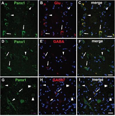 Figure 3: Double immunofluorescent staining of Panx1 in neurons in FCD. A-C. Representative confocal images show that strong Panx1 positive (green) DNs (arrows) colocalize with glutamate (Glu, red), and weak Panx1 positive (green) neurons (arrowheads) don’t colocalize with Glu (red). D-F. Merged images show colocalization of Panx1 (green) with γ-aminobutyric acid (GABA, red) in the normal-appearing neurons (arrows), but not in the DN (arrowhead). G-I. Double labeling staining shows colocalization of Panx1 (green) with glutamic acid decarboxylase 67 (GAD67, red) in normal-appearing neuron (arrow), but not in the DNs (arrowheads) and BCs (double arrowheads). 5-μm paraffin-embedded sections are counterstained with DAPI. Scale bars = 30 μm.