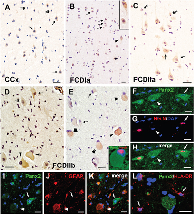 Figure 4: Panx2 immunoreactivity (IR) in cortical lesions of FCD. A. Weak to moderate Panx2 IR in neurons (arrows) and glial cells (double arrows) in gray matter of CCx. B. Panx2 IR in FCDIa. Weak to moderate Panx2 IR in neurons (arrows), including in microcolumns and HNs (arrowhead, insert in B). C. Panx2 IR in FCDIIa. Weak to moderate Panx2 IR in DNs (arrows) and glial cells (double arrows). D-E. Panx2 IR in FCDIIb. Moderate to strong Panx2 IR in BCs (arrowheads in D). Weak (double arrows in D) and strong (arrow in D) Panx2 IR in DNs. Clusters of weak (triple arrowheads in E), moderate (double arrowheads in E) and strong (arrowhead in E) Panx2 IR positive BCs in FCDIIb. Weak to moderate Panx2 IR in glial cells (arrows in E). F-H. Double labeling staining shows colocalization of Panx2 (green) with NeuN (red) in DN (arrow) in FCDIIb. Some Panx2 positive BC colocalize with NeuN ( insert in E), and some are NeuN negative (arrowhead). I-J. Representative confocal images show the GFAP (red) positive BC (arrowhead) and reactive astrocytes (doublearrows) colocalize with Panx2 (green). GFAP negative DN (arrow) with stronger Panx2 IR than the GFAP positive cells. L. Merged images shows the HLA-DR (red) positive microglias (arrows) don’t colocalize with Panx2 (green). 5-μm paraffin-embedded sections are counterstained with hematoxylin (A-E) or DAPI (F-L). Scale bars = (A-E) 30 μm, (F-L) 20 μm.