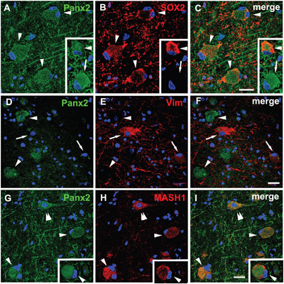 Considering the abnormal differentiation of the BCs and the specific cellular distribution of Panx2 in these cells, we investigated the correlation between the Panx2 expression and the differentiation status of the BCs. Double-labeled immunofluorescent experiments confirmed that the Panx2 was colocalized with SOX2 (a marker of neural stem cells commonly expressed by BCs [16]) in BCs (Figure 5A–5C). Further double-labeled staining showed that the Panx2 positive BCs did not express vimentin (a marker of immature glial cells) (Figure 5D-F), but expressed MASH1 (a basic helix-loop-helix transcription factor involved in the determination of neuronal precursors) (Figure 5G–5I).