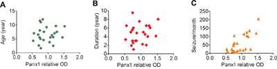 Figure 6: Correlation between the protein levels of Panx1 and different clinical variables in FCD. A, B. Scatter plot showing no significant correlation between the protein levels (relative optical density [OD]) of Panx1 and age at surgery (r = 0.135, P = 0.531), or duration of epilepsy (r = 0.182, P = 0.394). C. Scatter plot showing the significant positive correlation between the protein levels of Panx1 and seizure frequency (seizures per month), (r = 0.627. P = 0.001).