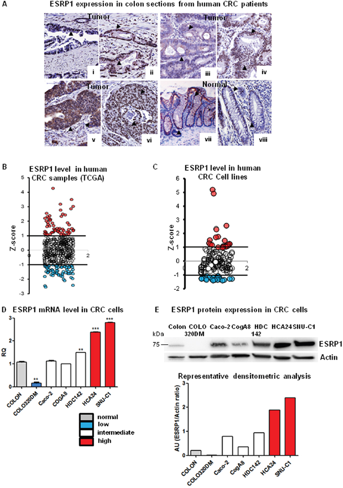 Figure 1: ESRP1 expression in CRC patients and cell lines. A. Immunohistochemical analysis of ESRP1expression in human CRC sections and normal colonic mucosa: i-vi: tumor (grade I-III), vii-viii: normal colon (scale bar, 100μM). Arrowheads show ESRP1 positivity. B. Z-score of ESRP1 mRNA expression levels from TCGA RNA-seq data (450 tumor samples), showing tumors with high (red dots) and low (blue dots) ESRP1 expression. Z-score between 1 and -1 was considered normal. C. ESRP1 expression in 151 CRC cell lines were extracted from GEO and show cell lines with z-score >1 and <-1. D. qRT-PCR analysis of ESRP1 mRNA levels in selected cells lines versus normal colon (n=6; t-test of cell lines versus normal colon is shown). E. Representative western blot and densitometric analyses of ESRP1 in selected CRC cell lines versus normal colon (3 independent experiments).
