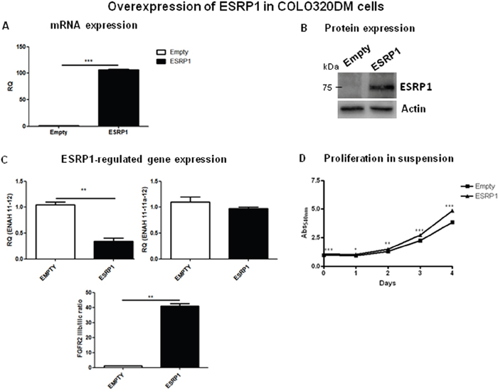 Figure 4: Overexpression of ESRP1 in COLO320DM cells. A. qRT-PCR and B. western blotting analyses of ESRP1 expression in ESRP1-overexpressing and control COLO320DM cells (n=2, 2 independent experiments). C. qRT-PCR analysis of ESRP1-regulated gene expression. D. MTT proliferation assays of ESRP1-overexpressing COLO320DM cells versus Empty controls grown in suspension (n=8, 2 independent experiments).