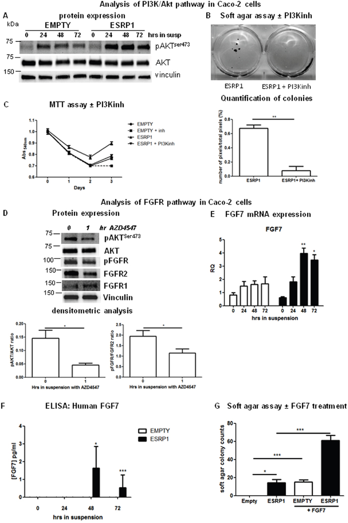 Figure 6: Pathways involved in ESRP1-driven CRC cell transformation. A. Western blot analysis of phospho-AKT (pAKTser473) expression in ESRP1-overexpressing Caco-2 cells versus Empty controls following growth in suspension for 72 h. Images are representative of 3 independent experiments. B. Soft agar assay and Image J software quantification of pixels/well (n=6) of ESRP1-overexpressing Caco-2 cells untreated or treated with PI3K inhibitor ZSTK474 (inh) (n=3, 2 independent experiments). C. MTT assay proliferation of ESRP1-overexpressing Caco-2 cells following PI3K inhibition versus Empty controls. D. Western blot and densitometric analyses of pAKTser473, total AKT, phospho-FGFRTyr6537654, total FGFR1 and FGFR2 expression in ESRP1-overexpressing Caco-2 cells grown in suspension untreated and treated for 1h with FGFR inhibitor (3 independent experiments). E. qRT-PCR analysis of FGF7 mRNA expression in ESRP1-overexpressing and control Caco-2 cells grown in suspension for 72 h (n=6, 3 independent experiments). F. ELISA for human FGF7 was performed in serum-free culture supernatant of ESRP1-overexpressing and control Caco-2 cells grown in suspension for 72 h (3 independent experiments). G. Soft agar assay colony counts of Empty and ESRP1-overexpressing Caco-2 cells, treated with FGF7 versus non-treated controls (n=3, 2 independent experiments).