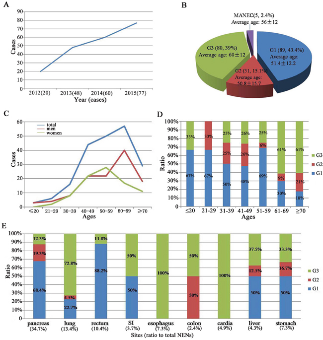 A total of 205 NENs were involved and showed a significant increase in incidence of NENs from 2012 (n = 20) to 2015 (n = 77, Figure 1A). There were 89 patients (43.4%) with NENs G1, 31 patients (15.1%) with NENs G2, 80 patients (39%) with NENs G3 and 5 patients (2.4%) with mixed adenoneuroendocrine carcinoma (MANEC). Mean age of G3 and MANEC was older than G1 and G2 with no significant difference (P = 0.213, Figure 1B). The most common age of NENs was 60 to 69 years in men while 50 to 59 years old in women (P < 0.05, Figure 1C). Tumor grading was strongly associated with age, especially > 60 years (P < 0.001, Figure 1D).