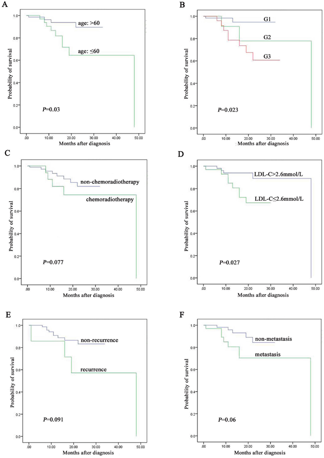 Figure 2: The prognostic factors assay by Kaplan-Meier analysis among the 157 NENs patients followed up. A. age was associated with prognosis of NENs. B. grading was associated with prognosis of NENs. C. chemoradiotherapy was not associated with prognosis of NENs. D. level of LDL-C was not associated with prognosis of NENs. E. recurrence was not associated with prognosis of NENs. F. metastasis was not associated with prognosis of NENs.
