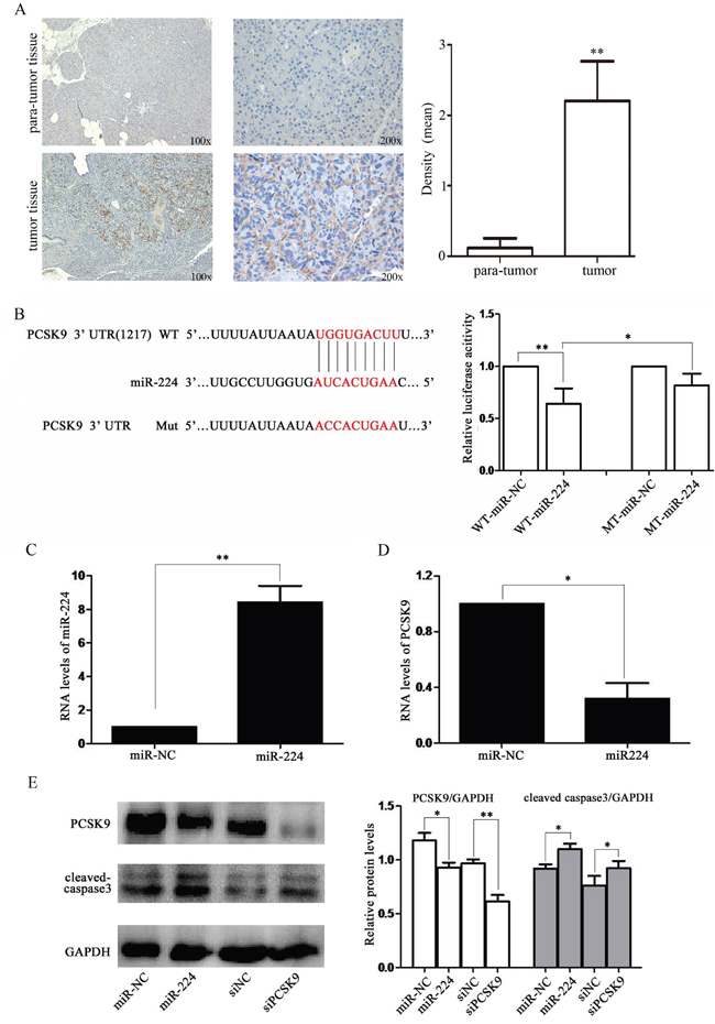 Figure 4: miR-224 down-regulates PCSK9 expression by directly targeting its 3′-UTR. A. PCSK9 expression was increased in tissue samples of p-NENs. Immunohistochemistry of PCSK9 in tumor and para-tumor samples from patients with NENs (n=6, 3 males and 3 females). There was almost non-staining of PCSK9 in the para-tumor samples, while strong staining of PCSK9 in tumor samples. B. RNA sequence alignment showed the 3′-UTR of PCSK9 mRNA contains a complementary site for miR-224. Dual luciferase reporter assay was performed to confirm the miR-224 binding target. C, D. RT-PCR analysis showed that the miR-224 expression was up-regulated and PCSK9 expression was down-regulated in BON-1 cells upon miR-224 transfection at mRNA levels. E. western blot analysis showed that the endogenous PCSK9 expression was significantly reduced at protein level followed by increased expression of cleaved caspase-3 upon miR-224 agomir or siPCSK9 transfection.