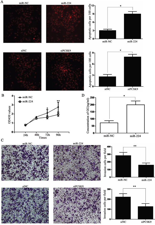 Figure 5: miR-224 agomir or siPCSK9 promotes apoptosis and suppresses proliferation, invasion of BON-1 cells. A. the TUNEL-positive cells was about 3% in miR-NC group and up to 8.9% in miR-224 agomir group. Meanwhile, it was 2.7% in siNC group and up to 8.2% in siPCSK9 group. B. CCK8 assay showed significantly lower proliferation potential in miR-224 agomir transfected cells than control group after 72 h. C. transwell assay showed significantly less invasive cells in miR-224 agomir group or siPCSK9 group than in control group. D. ELISA assay showed an increased level of GC in miR-224 agomir group than in miR-NC group.