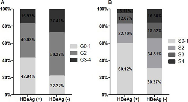 Figure 1: Distribution of liver necroinflammation grades (A) and fibrosis stages (B) by HBeAg status.