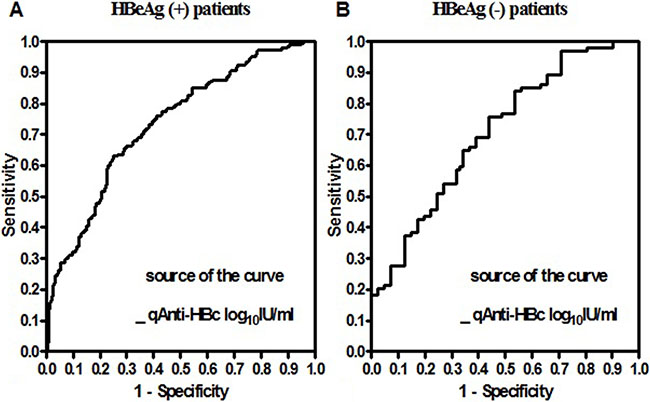 Figure 4: Receiver operating characteristic curves of serum qAnti-HBc levels used to distinguish moderate to severe fibrosis in HBeAg (+) (A) and HBeAg (–) (B) CHB patients.
