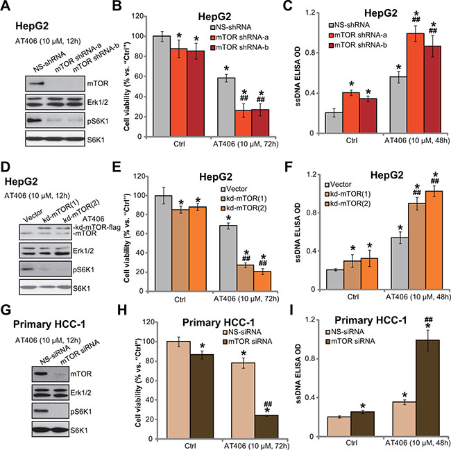 Figure 3: mTOR knockdown or mutation potentiates AT406’s cytotoxicity in HCC cells. The stable HepG2 cells, expressing mTOR shRNAs (“-a/-b”) or scramble non-sense control shRNA (“NS-shRNA”) (A–C), as well as kinase-dead (Asp-2338-Ala) mTOR (“kd-mTOR”, two lines, “-1/-2”) or the empty vector (pSuper-puro) (D–F), were stimulated with AT406 (10 μM) for indicated periods of time, expressions of listed proteins were shown (A and D); Cell viability (MTT assay, B and E) and cell apoptosis (ssDNA ELISA assay, C and F) were also tested. The primary HCC cells (“HCC-1”) transfected with scramble non-sense control siRNA (“NS-siRNA”) or mTOR siRNA (200 nM each, 24 hours) were stimulated with AT406 (10 μM) for indicated periods of time, expressions of listed proteins were shown (G); Cell viability (H) and cell apoptosis (I) were also tested. *indicated statistically significant differences as compared to “Ctrl” group. ##indicated statistically significant differences as compared to “NS-shRNA” (B and C)/“Vector” (E and F) /“NS-siRNA” group (H and I).
